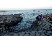 đá h́nh lăng trụ chất chồng như bát đĩa với màu đen huyền độc đáo. Ghềnh Đá Đĩa hay gành