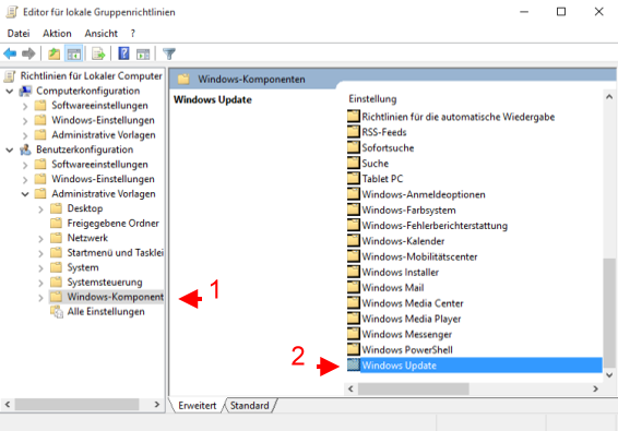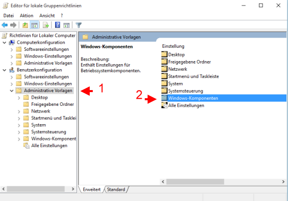 2- bấm vào "Administrative Vorlage", sau đó bấm vào "Windows-Komponenten"