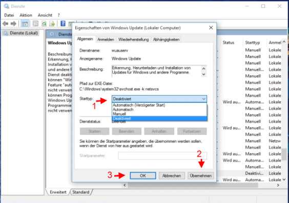 3- Bấm vào "Starttyp" chọn "Deaktiviert" - bấm "Übernehmen" - bấm "OK"