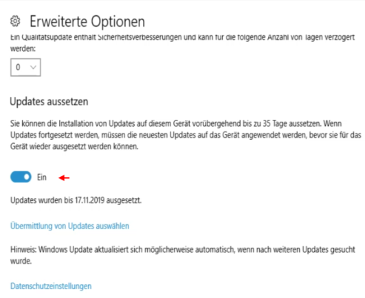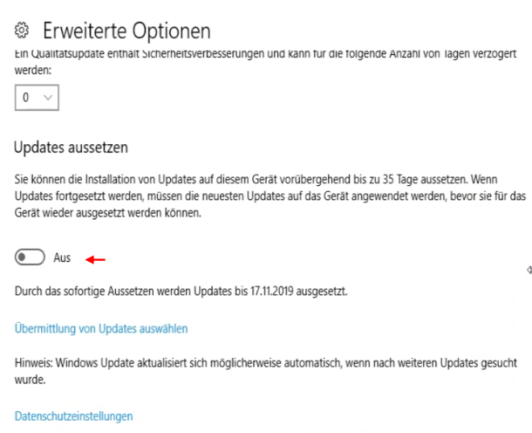 3- vào mục "Updates aussetzen" chọn "Ein"