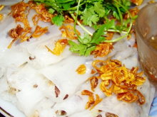 + Bắc chảo lên bếp, điều chỉnh lửa vừa phải, không liu riu nhỏ quá như hầm xương mà cũng không để lửa lớn như xào nấu. Dùng giấy bếp thấm chút dầu xoa một lớp nhẹ lên chảo, không cần thấm đẫm dầu quá sẽ làm lưu lại nhiều dầu trên chảo, khi cho bột vào sẽ khó bắt dính ḷng chảo. Có thể thử bằng cách múc chút bột vào chảo, nếu nghe âm thanh xèo 1 cái tức là chảo quá nóng, cần hạ bớt lửa. + Mỗi lần múc bột vào chảo th́ nên khuấy đều tô bột v́ bột thường lắng bên dưới, nếu chỉ múc bên trên th́ sẽ toàn nước. Một tay múc bột (1 muôi chừng 80~100ml tùy chảo lớn, nhỏ) đổ vào chảo, tay kia cầm chảo láng đều cho bột bắt dính trên toàn bề mặt ḷng chảo thành lớp thật mỏng. Đậy vung cho bột mau chín. Khi bột chín sẽ thấy bột trong. + Dùng đáy khuôn bánh áp vào lớp bột, nghiêng chảo cho vỏ bánh cuốn phủ vào đáy khuôn để lấy ra. Nếu dùng đĩa to để lấy bánh th́ cũng làm tương tự, tuy nhiên sẽ rất nóng tay, coi chừng bị bỏng. Sau khi lấy lớp bánh ra lại xoa dầu lên ḷng chảo và múc tiếp muôi bột khác đổ vào chảo láng đều và đậy vung. + Trong khi chờ lớp bột mới chín th́ cuốn lớp vỏ bánh vừa lấy ra này. Cho 1 th́a nhỏ nhân, dàn đều trên vỏ bánh và cuốn lại. Tùy ư cuốn theo cách nào ḿnh quen tay. Người Nam thường gói nhân bên trong như cái gỏi cuốn, c̣n người Bắc th́ cuốn rồi xếp lớp vỏ bánh thừa bên dưới để lớp nhân bên trên chỉ bị phủ một lớp bánh mỏng trông sẽ ngon hơn. 1 vỏ bánh có thể cuốn thành 1-2 cái bánh. Lặp lại tuần tự các bước trên cho tới khi tráng hết bột là xong. 4. Đồ ăn kèm:nếu có gị lụa, chả quế và rau ng̣ (rau mùi) ăn cùng sẽ rất ngon.Bày bánh cuốn ra đĩa, rắc hành phi, rau mùi, ăn ngay khi mới tráng bánh c̣n ấm nóng là ngon nhất.