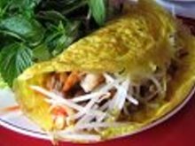 đều. Cho giá đỗ và một phần nhân tôm đă xào lên trên bánh,