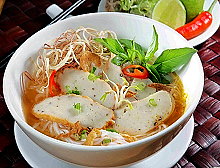 Xếp bún, dọc mùng vào tô, chan nước dùng, rắc hành phi, hành lá, đầu hành chần,