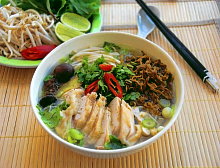 - Bún đem chần qua nước sôi rồi chia đều ra các tô, rắc lên trên thịt gà đã xé