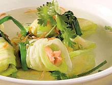 - Bắp cải mềm, múc ra bát dùng nóng, rắc hành lá đã thái nhỏ lên bề mặt bát
