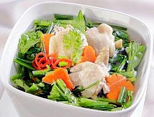 - Cải bó xôi cắt khúc 4cm. Cà rốt tỉa hoa cắt lát. Gừng cắt lát, đập dập. Hành