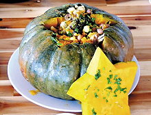 - Cho tất cả nguyên liệu vào bí đỏ và đem hấp với nước dừa khoảng 20 phút là