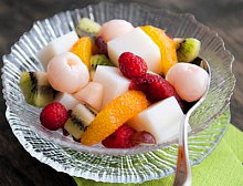 Nguyên liệu - 2 lít nước - 28g bột thạch agar - 100g đường trắng - 360ml sữa - 30ml hạnh nhân chiết xuất - Các loại hoa quả tươi có sẵn trong mùa hè mà bạn thích (quưt, nho, vải tươi hoặc vải đóng hộp, lê, kiwi... tùy ư) - Si-rô đơn giản (Cho đường vào nước rồi đun sôi cho đường ḥa tan. Nước đường có vị ngọt vừa là được) Cách làm : - Trong một chảo lớn, cho nước vào