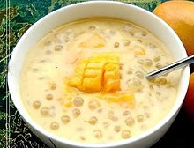 Nguyên liệu - 3 quả xoài - 300 ml nước cốt dừa - 200 gr hạt trân châu khô - 100ml sữa tươi - Đường kính Cách làm : - Ngâm hạt trân châu khô trong nước 15 phút rồi cho vào nồi nước sôi chần chín, khi các hạt chân trâu trở nên trong suốt là được. Vớt trân châu ra cho vào nước lạnh để tránh dính vào nhau. - Xoài chín gọt vỏ, 1 nửa cắt miếng nhỏ, c̣n một nửa chỗ xoài cho vào máy xay sinh tố cùng với sữa tươi và nước cốt dừa, xay nhuyễn. Có thể cho thêm đường nếu muốn. - Đổ hỗn hợp xoài cốt dừa ra bát, trộn hạt trân châu vào, cho phần xoài thái miếng c̣n lại ban đầu vào nữa.