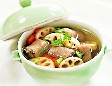 Nguyên liệu - chân gị trước 1cai khoảng 1kg - củ sen 150g - hạt sen 30g -hoa sen 1 bông - rau mùi 5 nhánh để trang tri - nước mắm 1 th́a Cafe - muối 1/2 th́a cafe - ḿ chinh 1/4 thia cafe -đường 1/4 th́a cafe Cách làm :