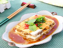 - Phi thơm gừng băm, cho 1/2 chén nước hấp đậu hũ vào, nêm 1/2M nước tương, 1/3m