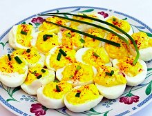 Nguyên liệu - 12 quả trứng gà to - 40g mayonnaise - Hạt tiêu, ớt bột, Bột th́ là, muối. Cách làm :