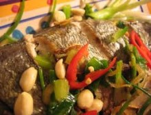 Cá chín mang ra cho thì là và cọng hành tươi đã chẻ hoa lên cá