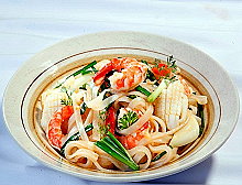 sợi, hành lá, đậu phộng và tôm mực vào đảo đều sau đó tắt lửa.