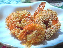 - Lăn tôm qua bột ḿ, trứng gà và hỗn hợp mè trắng mè đen. Khi tôm vàng gịn,
