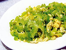 - Cho khổ qua xào trứng ra dĩa, rắc thêm tiêu, ngò rí và lòng đỏ trứng muối lên