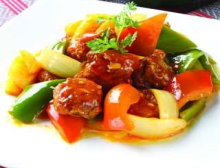 Nguyên liệu - 500g sườn non - 300g ớt chuông - 1/2 củ hành tây, mớ hành lá. - 1 trái dứa, 1 trái cam , vỉ Ngô non - 1/2 th́a cà phê tỏi băm, 1/2 th́a cà phê hạt nêm, 1/2 th́a cà phê dầu màu điều - 1 gói bột chiên gịn - Dầu ăn, bột năng. Cách làm :