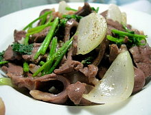 thịt và hành cùng chín tới th́ cho hành lá cắt khúc vào, đảo đều. Rắc hạt tiêu