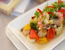 Nguyên liệu - 250g tôm tươi hoặc tôm đông lạnh - ½ củ hành tây, thái miếng vuông - ½ cây bông cải xanh, thái miếng - ½ quả ớt chuông đỏ, vàng, thái miếng vuông - 1 ít nấm trắng, 1 ít nấm hương ngâm nở - Hạt nêm, dầu hào - Tỏi đập dập, 1 cây hành xanh thái nhỏ Cách làm :