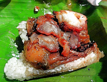 Bước 8: Cho xôi ra dĩa, gắp thịt gà lên mặt xôi, rưới mỡ hành lên trên rồi